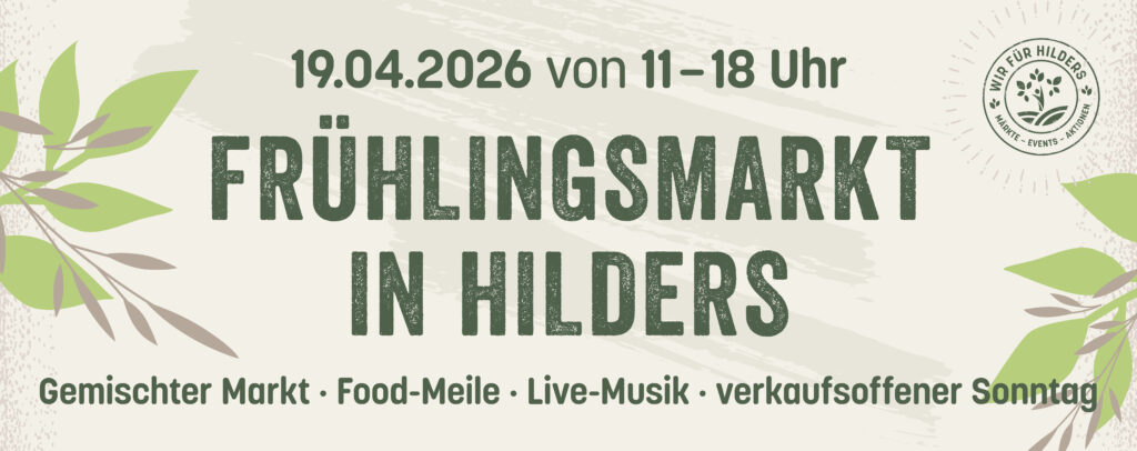 Am Sonntag, den 19. April 2026, lädt der Verein Wir für Hilders e. V. von 11 bis 18 Uhr zum traditionellen Frühlingsmarkt in Hilders ein. Besucher dürfen sich auf ein vielfältiges Marktgeschehen, kulinarische Köstlichkeiten, Live-Musik und zahlreiche Angebote freuen.